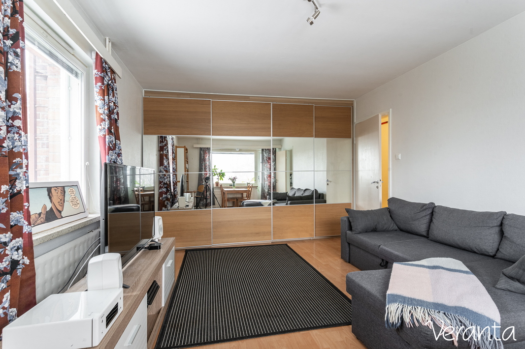 Asunnon avaraan olohuoneeseen tulvii valoa kahdesta suunnasta ja olohuoneesta on kulku omalle parvekkeelle, josta on näkymä yhtiön rauhalliselle takapihalle.