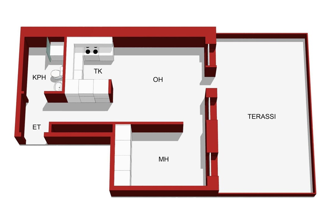 luovat asumiseen viihtyisyyttä. Valkoinen valoisa keittiö, josta löytyy kaikki tarpeellinen. Makuuhuoneessa on koko seinällinen kaapistoa.