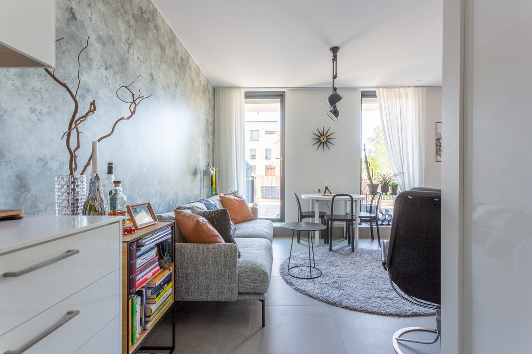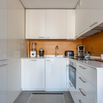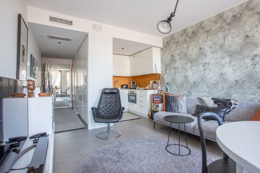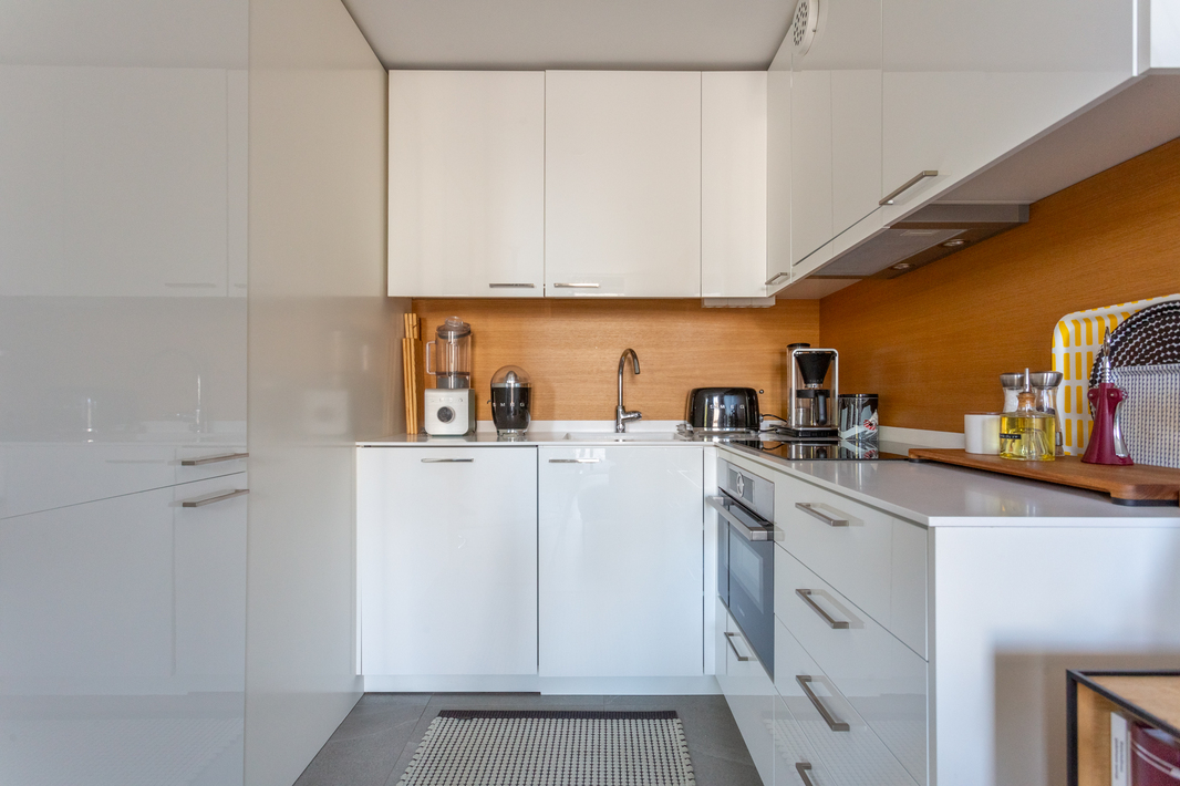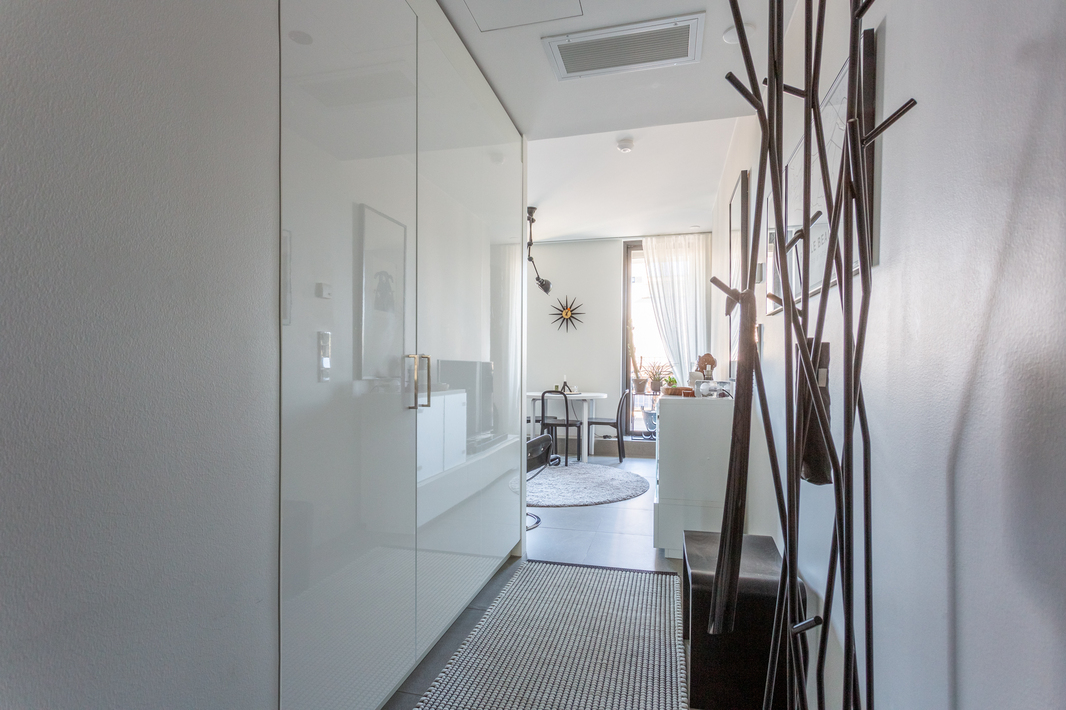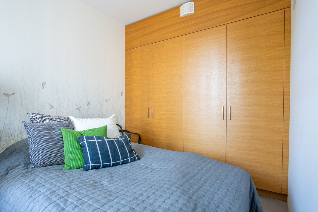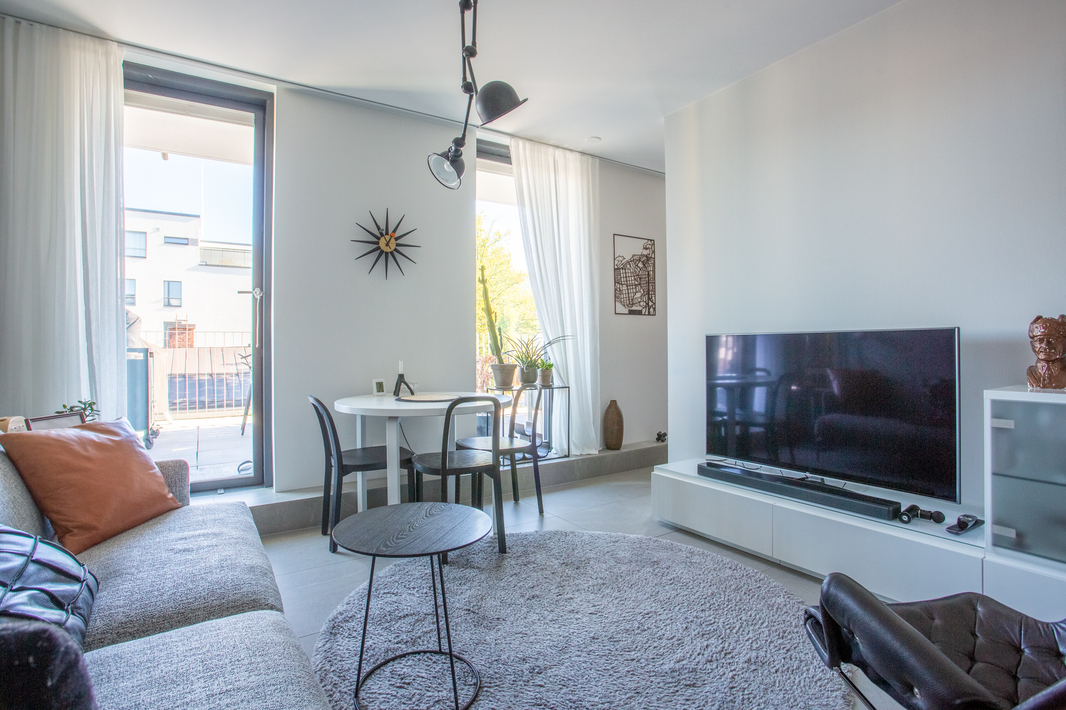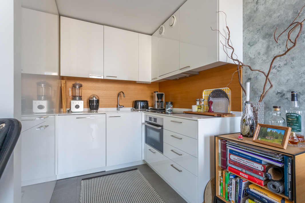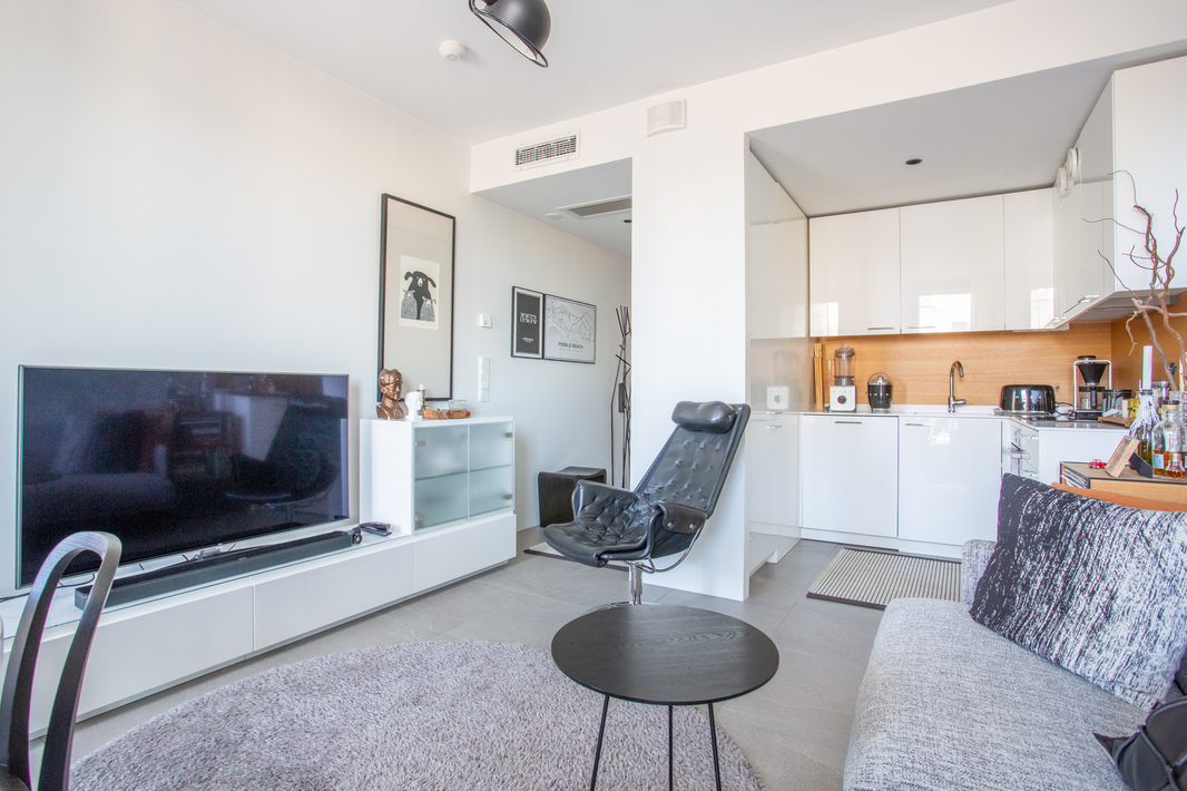 High-quality materials have been used throughout the interior, and the harmonious color palette creates a comfortable living atmosphere. The bright white kitchen is fully equipped with everything you need. The bedroom features an entire wall of built-in wardrobes.
