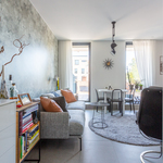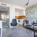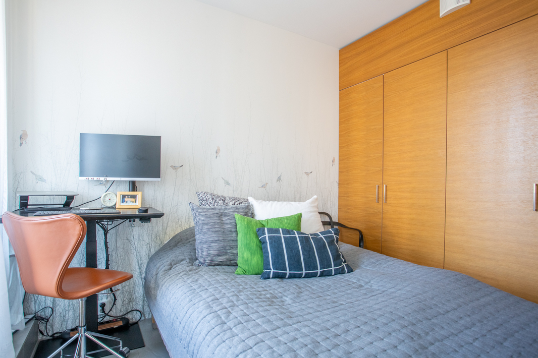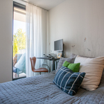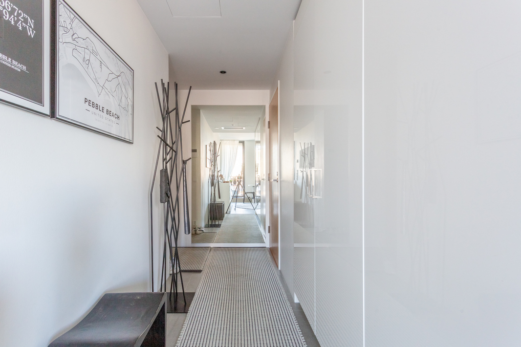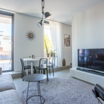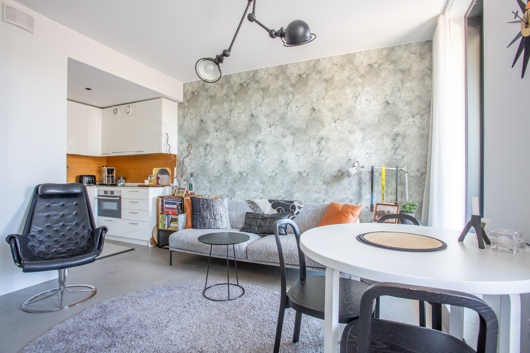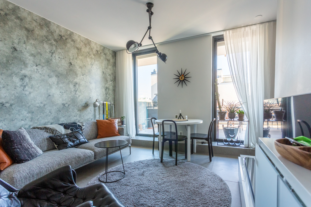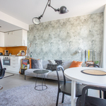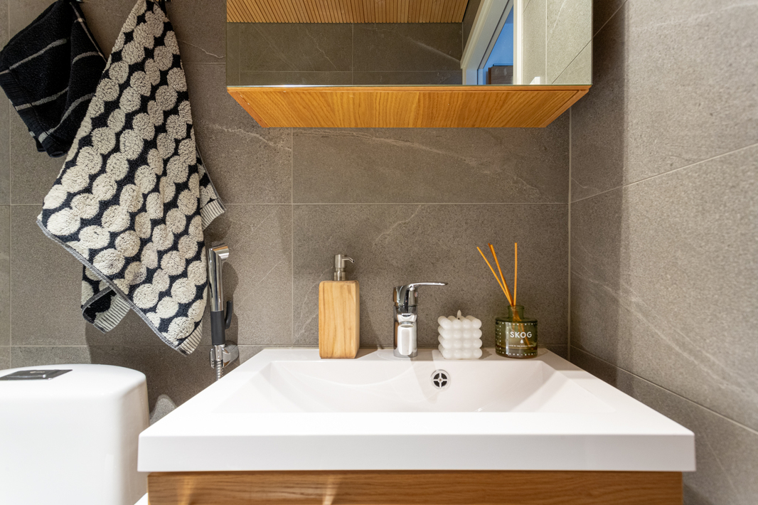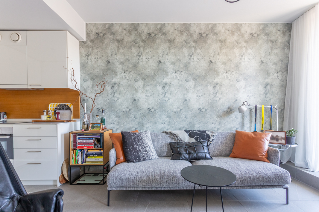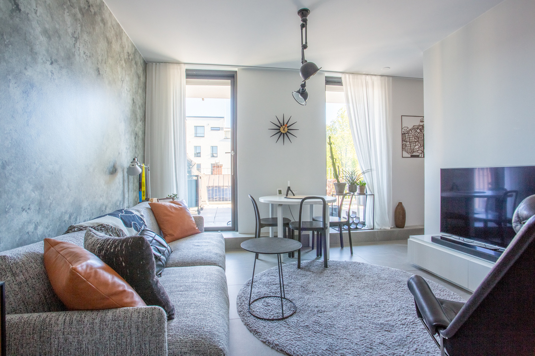 High-quality materials have been used throughout the interior, and the harmonious color palette creates a comfortable living atmosphere. The bright white kitchen is fully equipped with everything you need. The bedroom features an entire wall of built-in wardrobes.