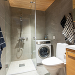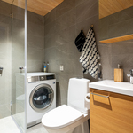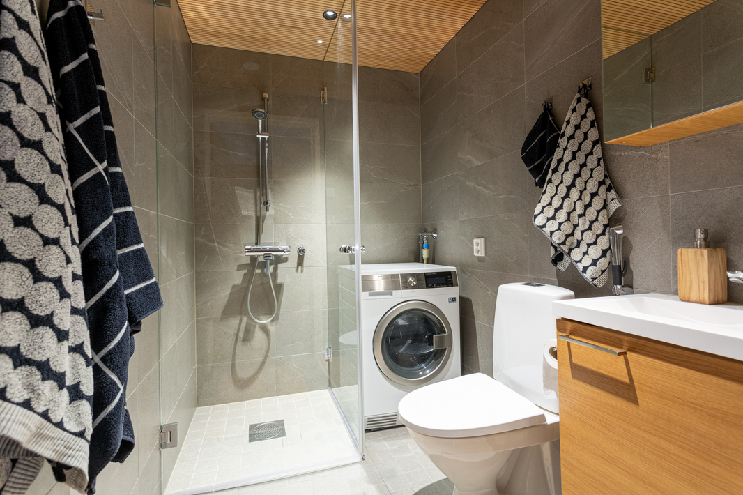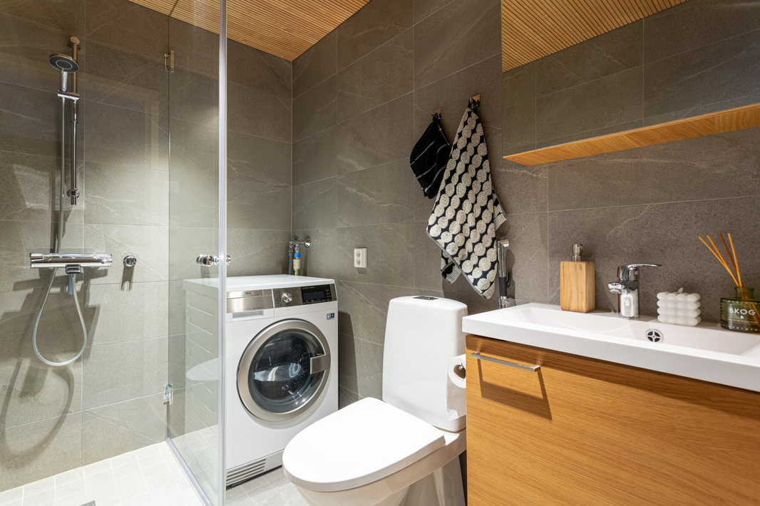 Laatoitettu kompakti kylpyhuone, jossa on tilavaraus pyykinpesutornille.