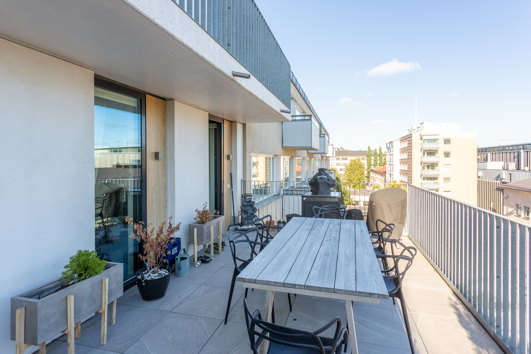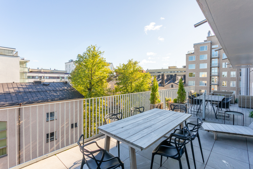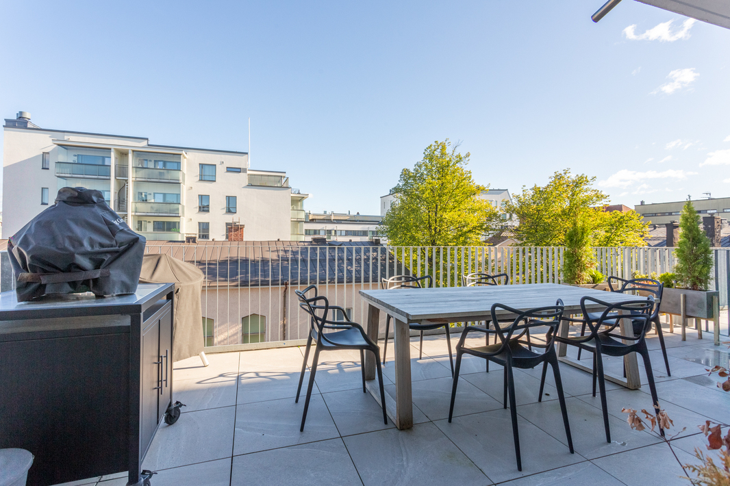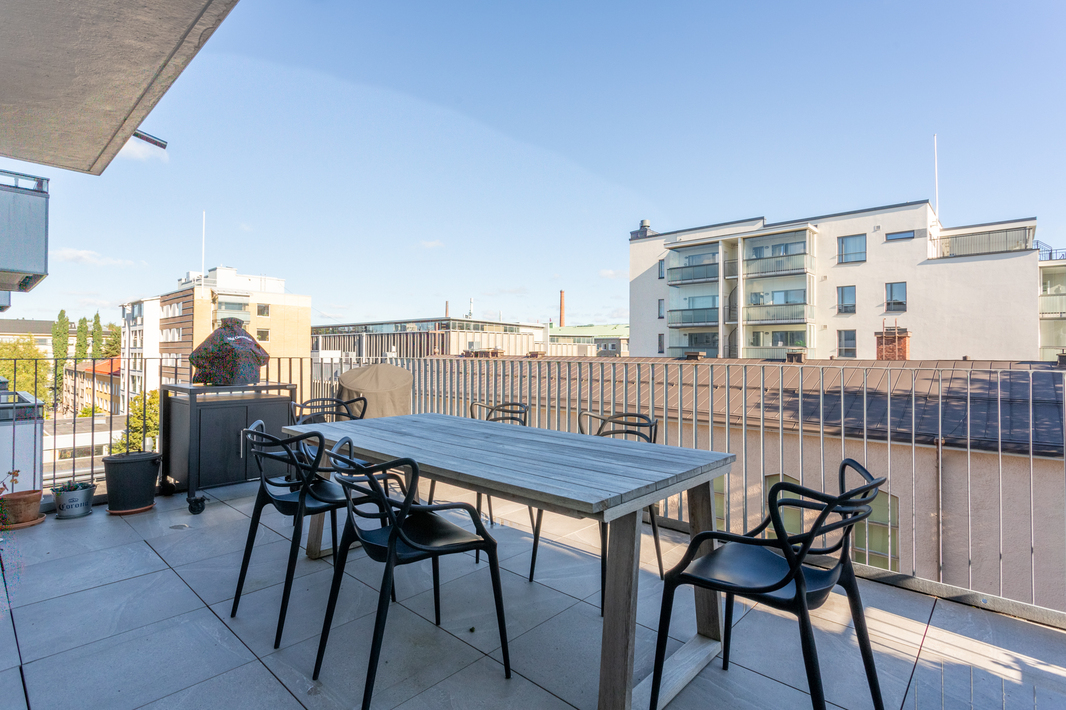 Lisätilaa antaa valtaisa 25m2.:n terassi, aamu- ja päiväauringon puolelle, näkymät sisäpihalle! Terassilla voit grillata ja nauttia auringosta!