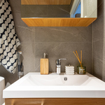 | Kylpyhuoneen kuvaus | Seinäpinnat harmaa laatta, lattiapinta laatoitettu, suihkuseinä, suihku, peilikaappi, allaskaappi, valumarmoriallas, Oras-hanat, Bidetta- käsisuihkulla. Tilavaraus- ja liitäntä pyykinpesutonille. |