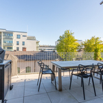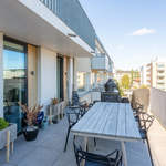The tiled, compact bathroom includes space for a washing machine and dryer. An impressive 25 m² terrace on the morning and midday sun side overlooks the courtyard — perfect for grilling and enjoying the sunshine!