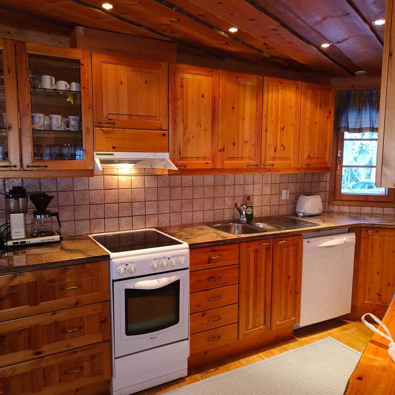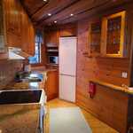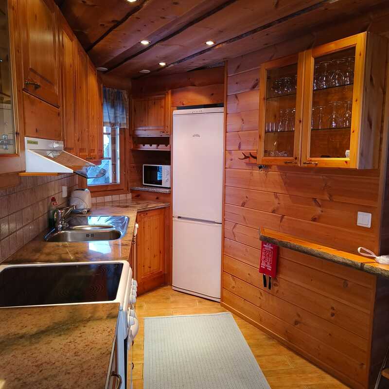 Keittiössä on kaikki tarpeellinen varustus. Lämpöä ja tunnelmaa antaa luonnonkivitakka.