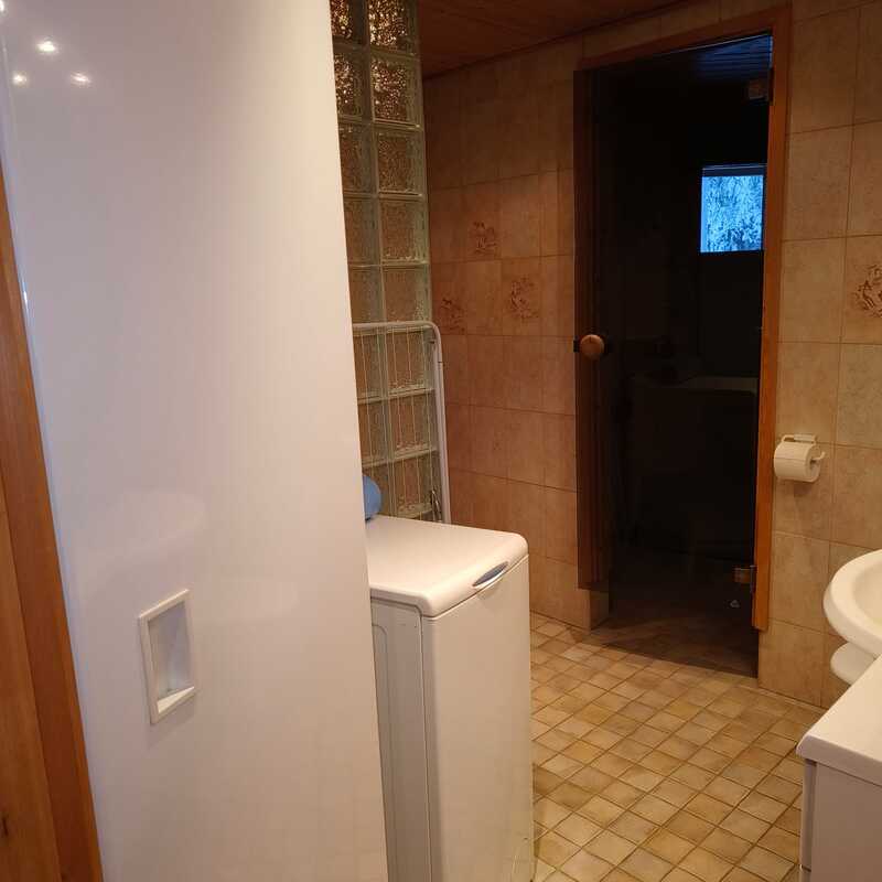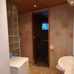 | Kylpyhuoneen kuvaus | Lattia- ja seinäpinnat laatoitus, suihku, wc-istuin, allaskaappi. peilikaappi, saunassa on ikkuna, erillinen wc. |