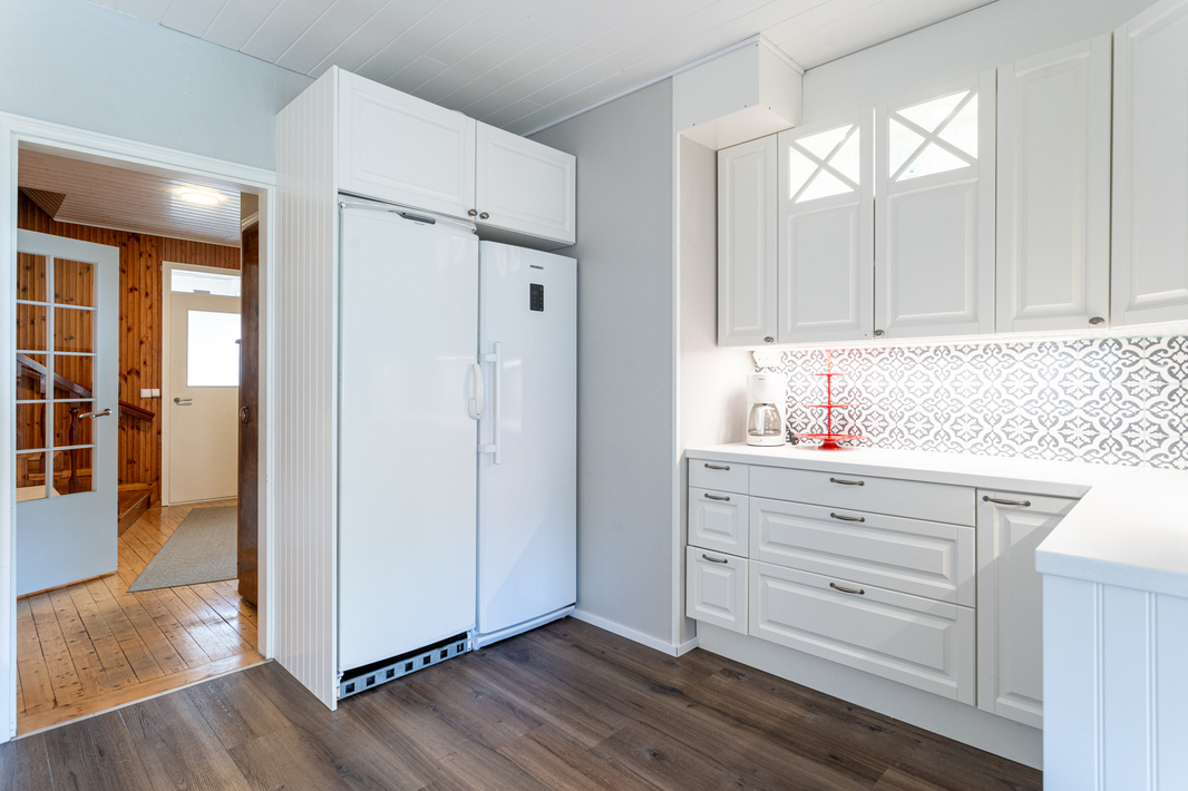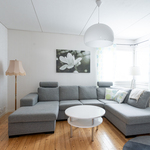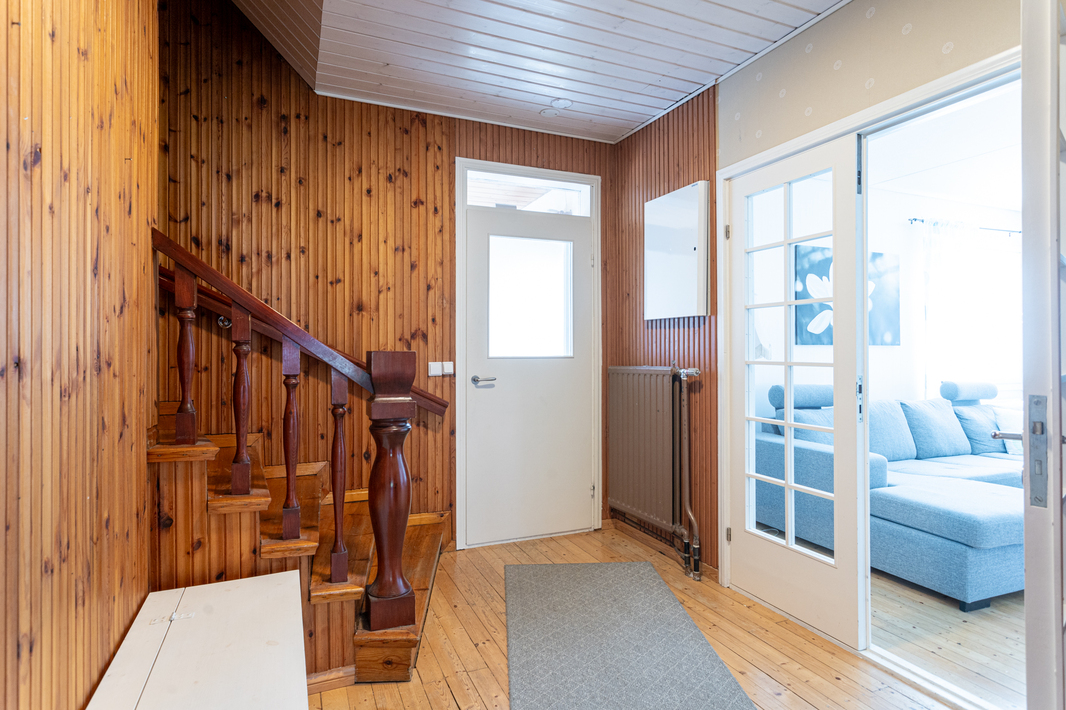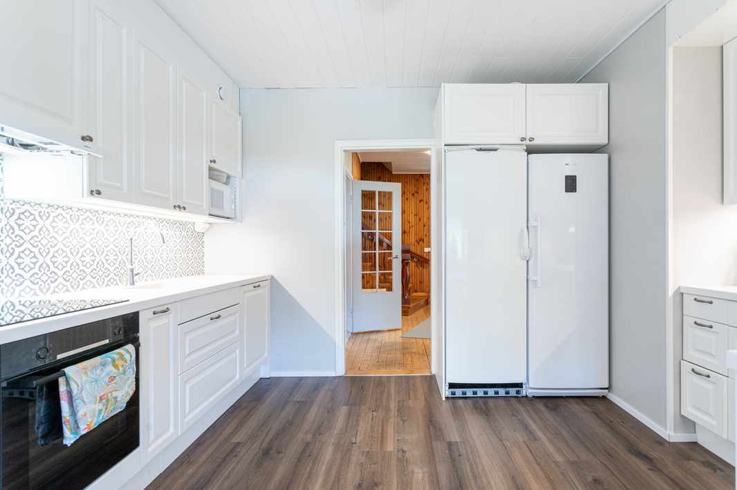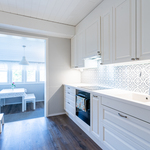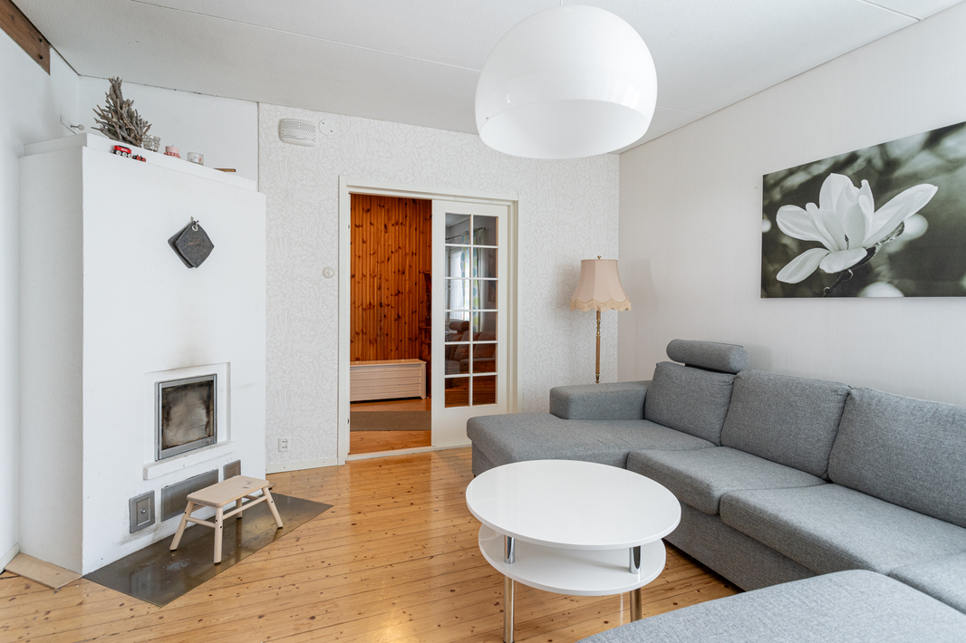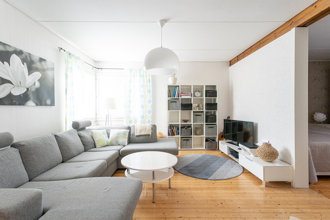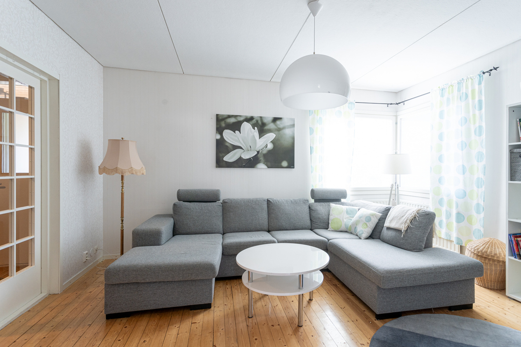 Keskikerroksessa sijaitsevaan olohuoneeseen suorastaan tulvii valoa isojen ikkunoiden ansiosta ja makuuhuone, muutenkin rauhallisella alueella avautuu takapihalle päin. Keittiö ja ruokailutila on päivitetty nykyaikaiseksi vuonna 2021. Kylpyhuone ja asunnon sisäsauna on myöskin keskikerroksessa.