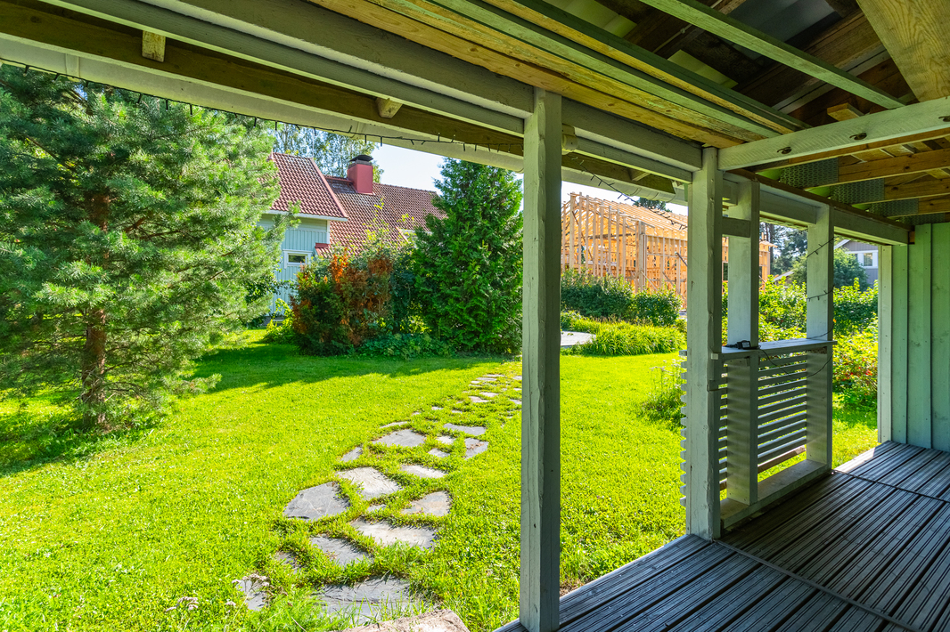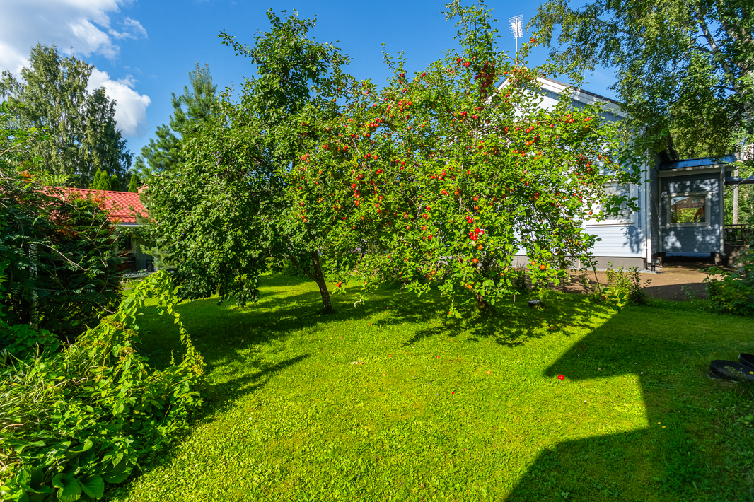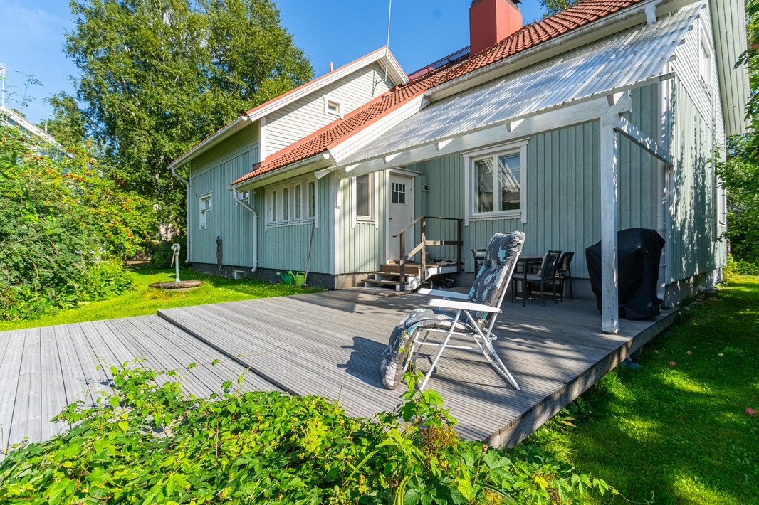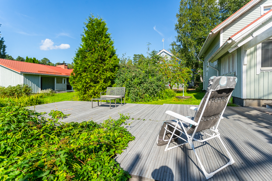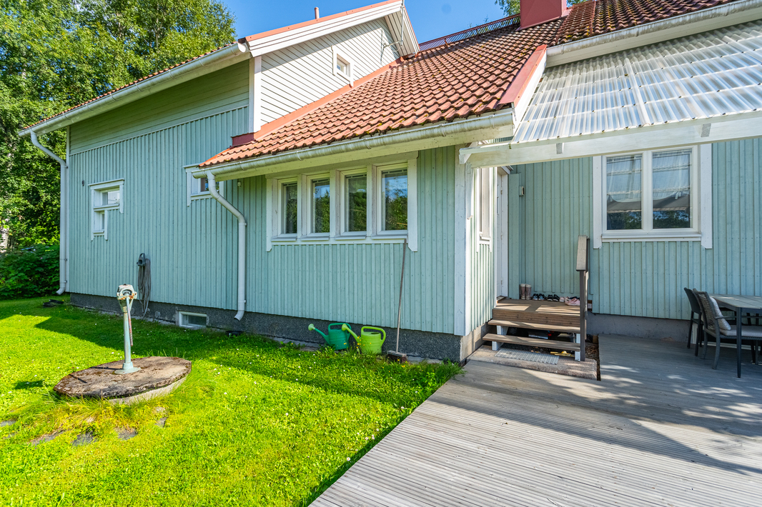 Oma 1053 m2 puutarhamainen tontti on suojainen ja siinä riittää lapsille tilaa temmeltää. Katetulla terassilla on mahdollisuus pitää isommatkin puutarhajuhlat ja tunnelmallinen pihasauna kruunaa tämän omakotitaloasumisen viihtyisyyden.