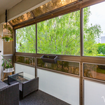 Toisen kerroksen asunnon olohuone on avara ja isot ikkunat avautuvat etelään sekä länteen. Olohuoneesta on kulku lännen puoleiselle lasitetulle parvekkeelle, joka antaa lisää tilaa jo valmiiksi isoon asuntoon.